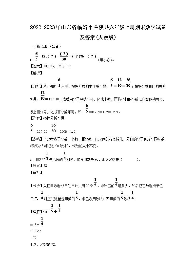 時間:2025-06-05 16:46:00 來源:無憂考網(wǎng) [字體:小 中 大]【文檔名稱】 2022-2023年山東省臨沂市蘭陵縣六年級上冊期末數(shù)學(xué)試卷及答案(人教版)(Word版).doc