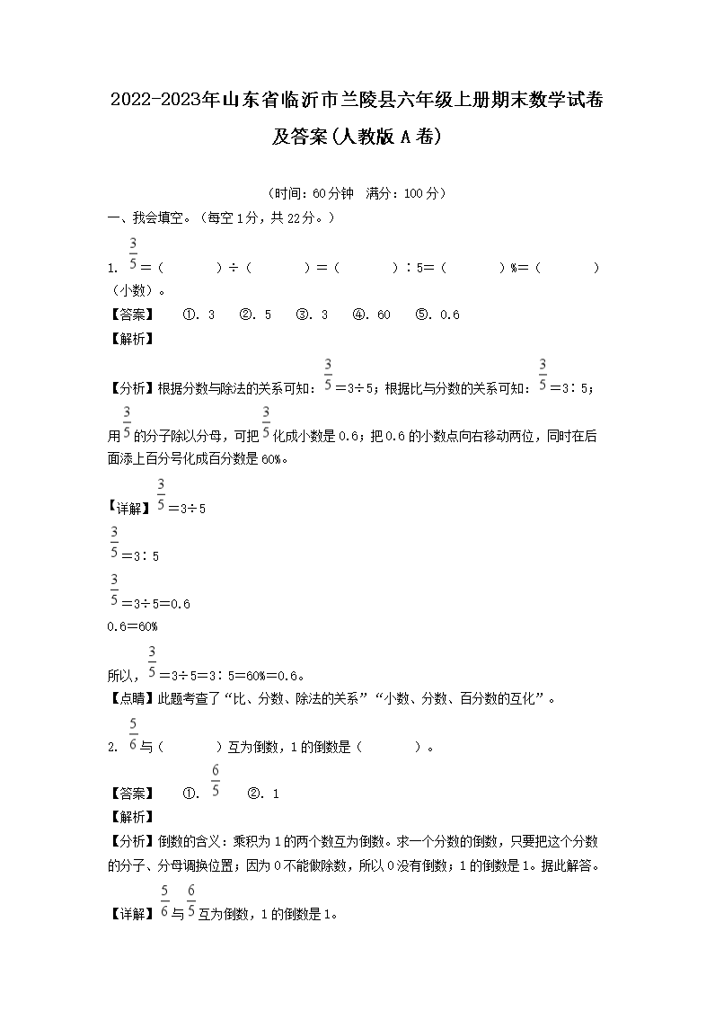 2022-2023年山東省臨沂市蘭陵縣六年級上冊期末數(shù)學(xué)試卷及答案(人教版A卷)(Word版)