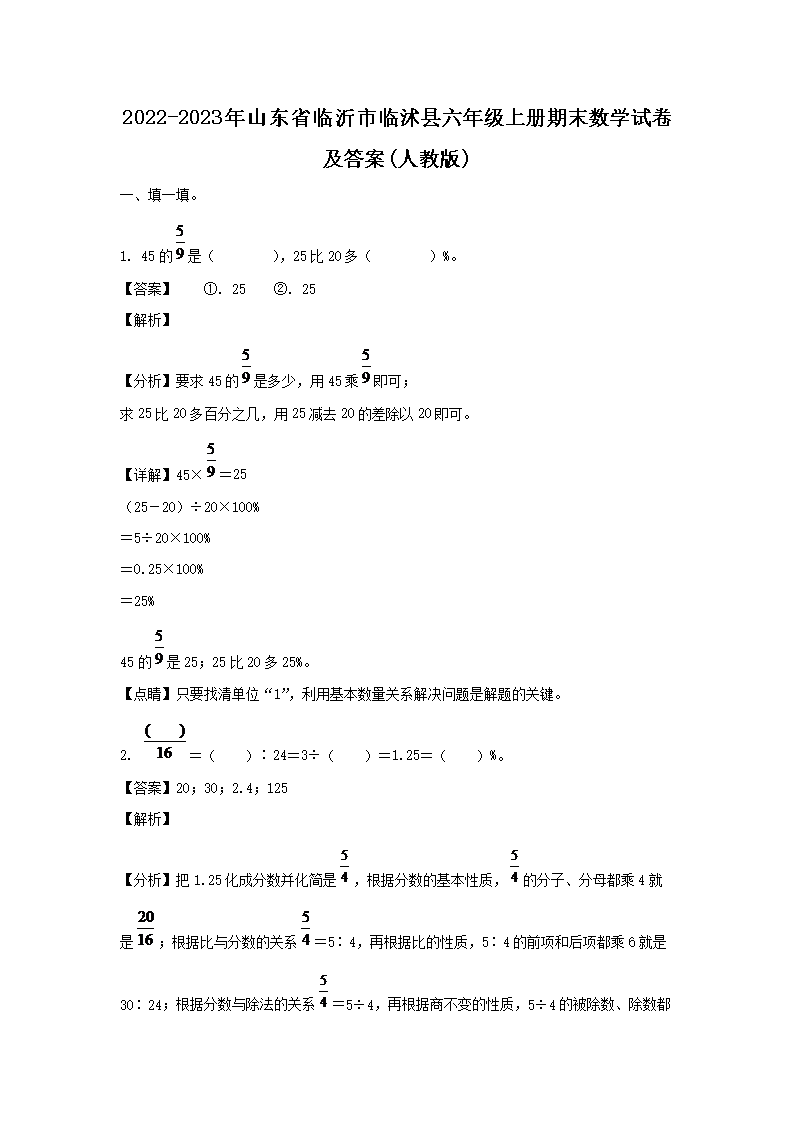 - 2022-2023年山東省臨沂市莒南縣六年級(jí)上冊(cè)期末數(shù)學(xué)試卷及答案(人教版)