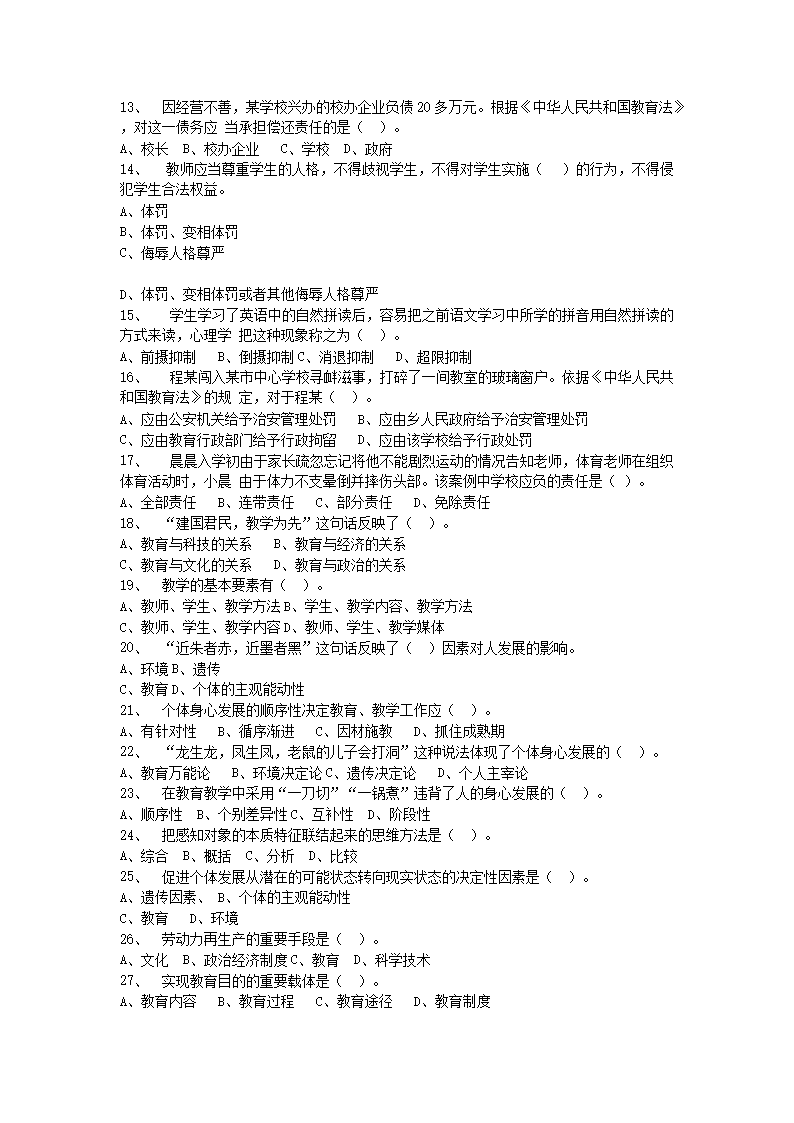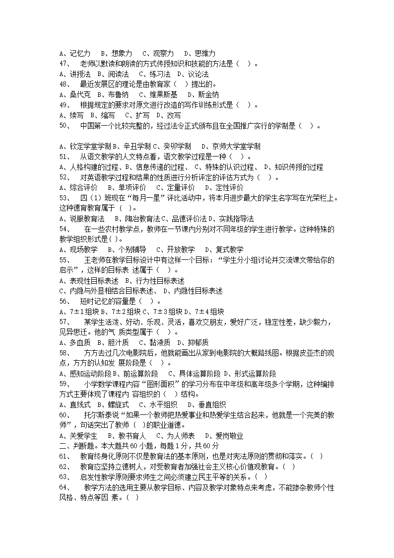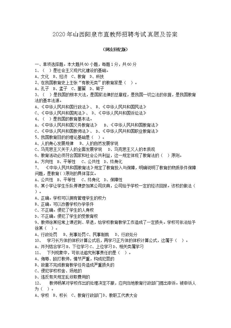 【文檔名稱】 2020年山西陽泉市直教師招聘考試真題及答案(Word版).doc