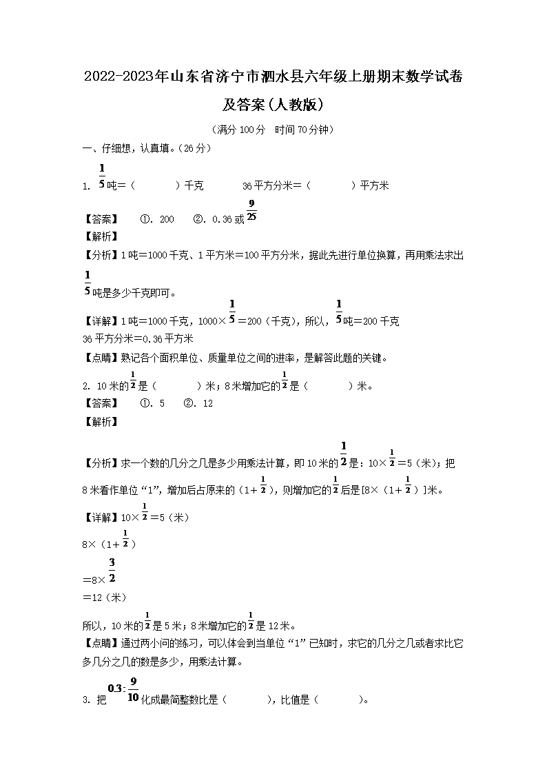 2022-2023年山東省濟(jì)寧市泗水縣六年級(jí)上冊(cè)期末數(shù)學(xué)試卷及答案(人教版)(Word版)