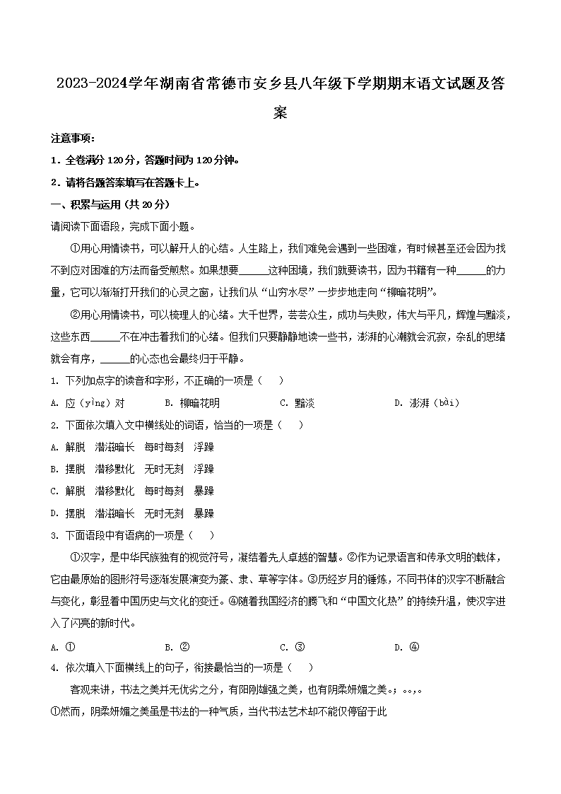 時間:2025-06-06 17:42:00 來源:無憂考網(wǎng) [字體:小 中 大]【文檔名稱】 2023-2024學(xué)年湖南省常德市安鄉(xiāng)縣八年級下學(xué)期期末語文試題及答案(Word版).doc