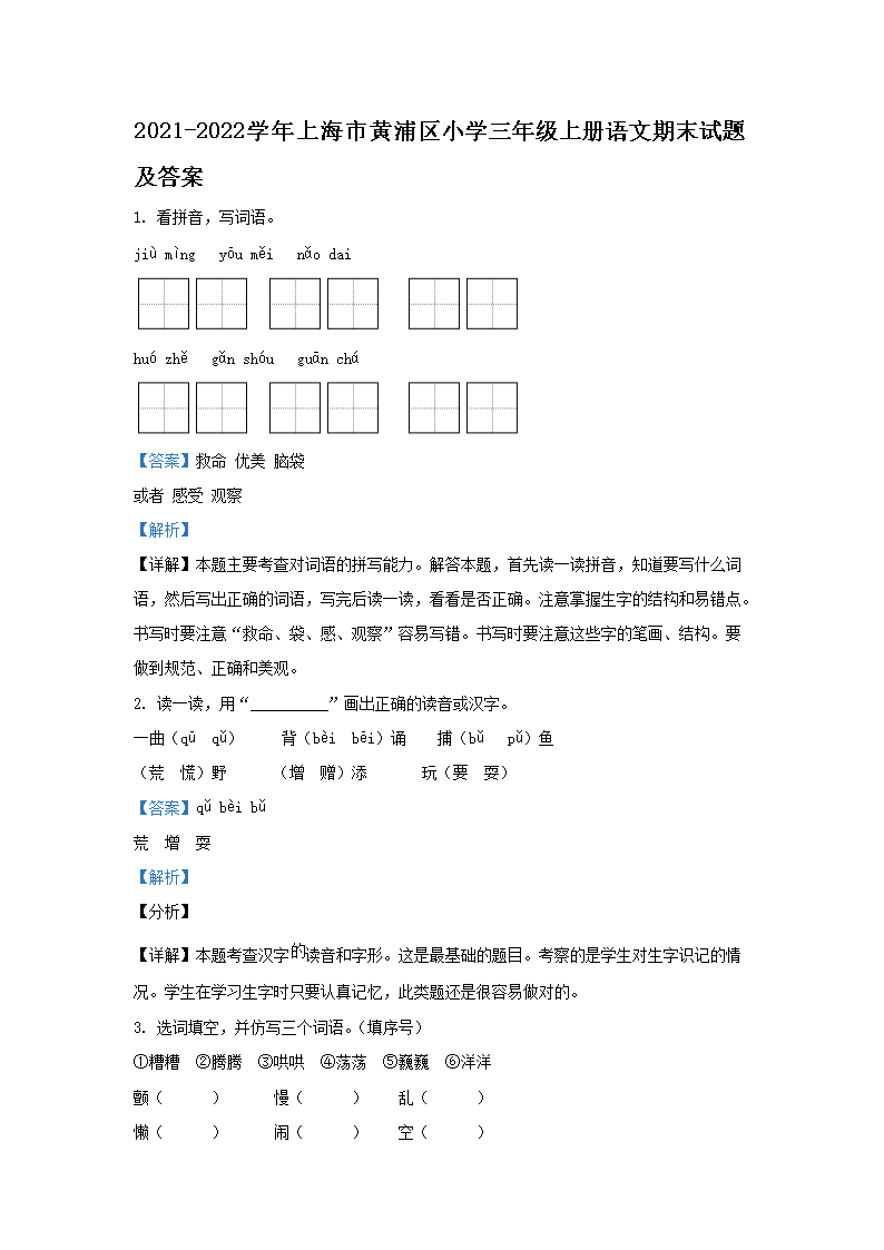 2021-2022學(xué)年上海市黃浦區(qū)小學(xué)三年級(jí)上冊(cè)語(yǔ)文期末試題及答案(Word版)