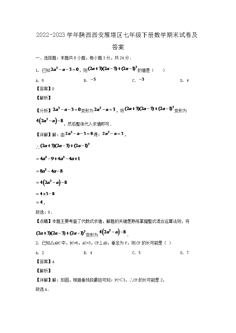 2022-2023學(xué)年陜西西安雁塔區(qū)七年級下冊數(shù)學(xué)期末試卷及答案(Word版)