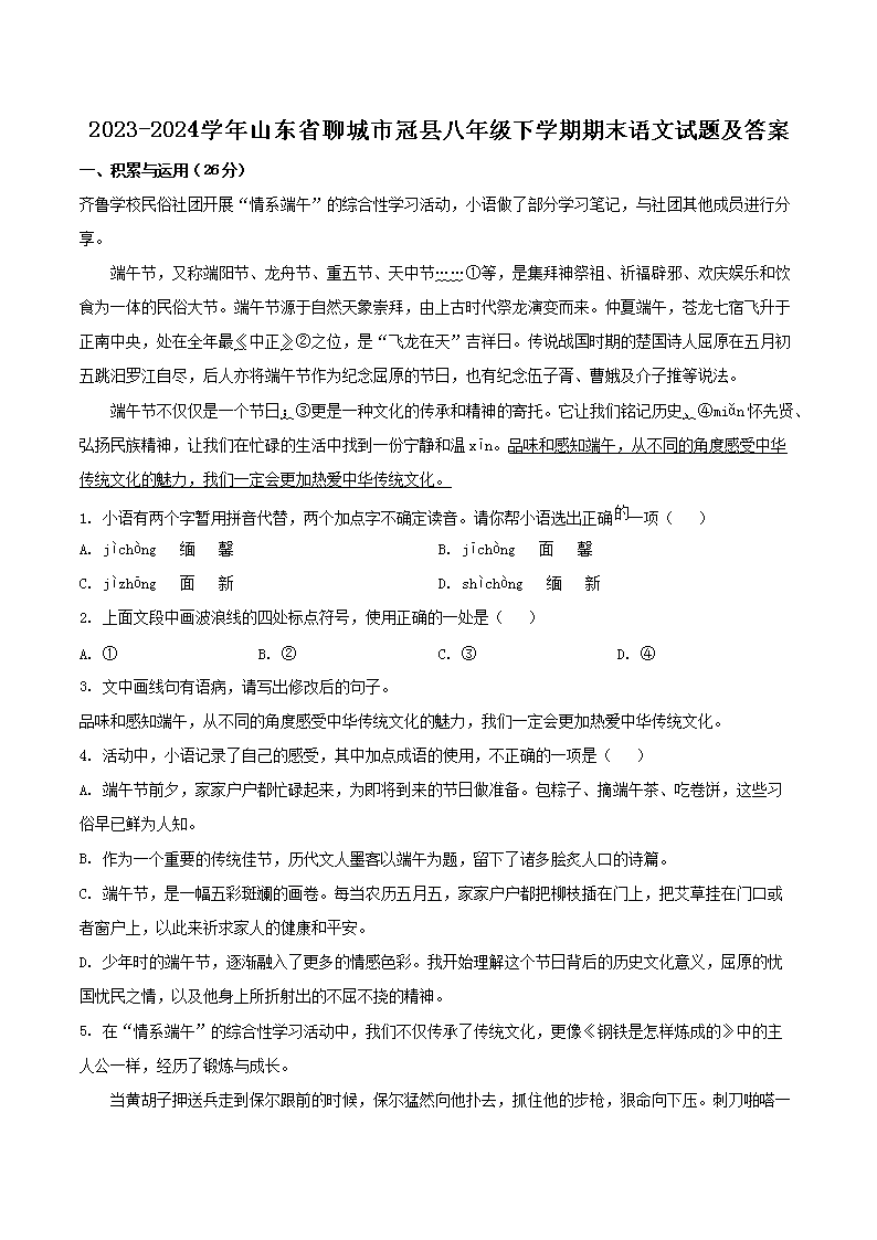 2023-2024學(xué)年山東省聊城市冠縣八年級(jí)下學(xué)期期末語(yǔ)文試題及答案(Word版)