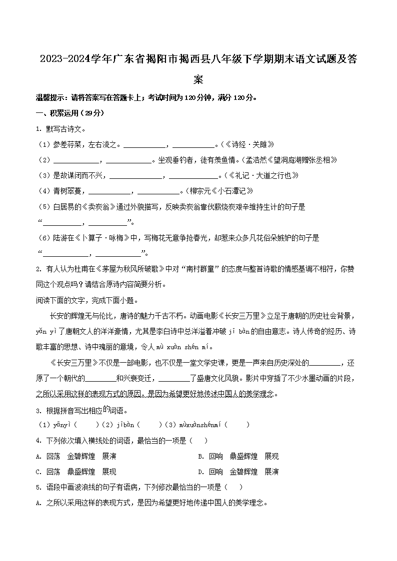 【文檔名稱】 2023-2024學年廣東省揭陽市揭西縣八年級下學期期末語文試題及答案(Word版).doc