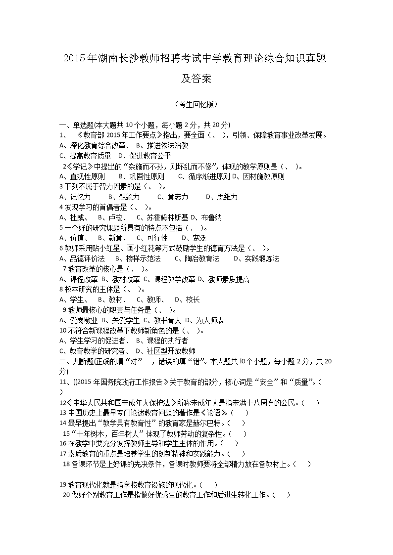 【文檔名稱】 2015年湖南長沙教師招聘考試中學(xué)教育理論綜合知識真題及答案(Word版).doc