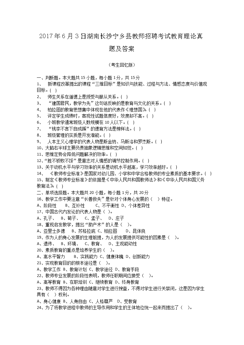 【文檔名稱】 2017年6月3日湖南長沙寧鄉(xiāng)縣教師招聘考試教育理論真題及答案(Word版).doc