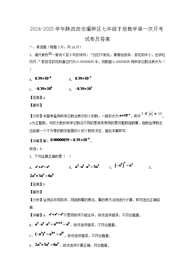 時(shí)間:2025-06-11 17:04:00 來(lái)源:無(wú)憂考網(wǎng) [字體:小 中 大]【文檔名稱】 2024-2025學(xué)年陜西西安灞橋區(qū)七年級(jí)下冊(cè)數(shù)學(xué)第一次月考試卷及答案(Word版).doc