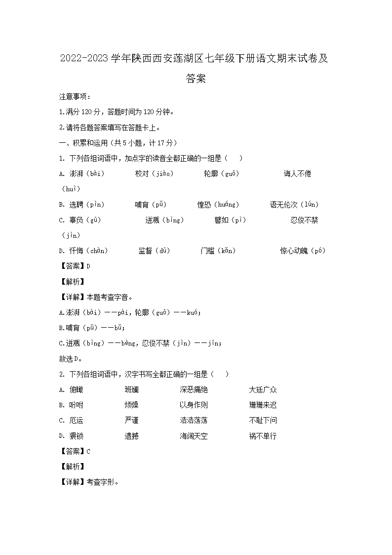 【文檔名稱】 2022-2023學(xué)年陜西西安蓮湖區(qū)七年級下冊語文期末試卷及答案(Word版).doc