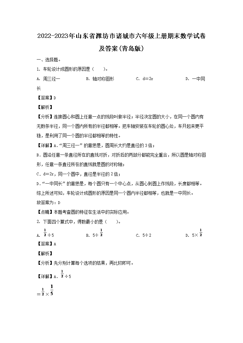 【文檔預(yù)覽】 無憂考網(wǎng)整理發(fā)布2022-2023年山東省濰坊市諸城市六年級(jí)上冊(cè)期末數(shù)學(xué)試卷及答案(青島版)(Word版),前五頁預(yù)覽如下: