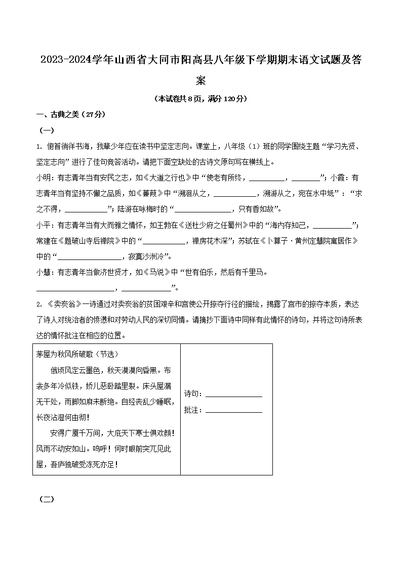 【文檔名稱】 2023-2024學年山西省大同市陽高縣八年級下學期期末語文試題及答案(Word版).doc