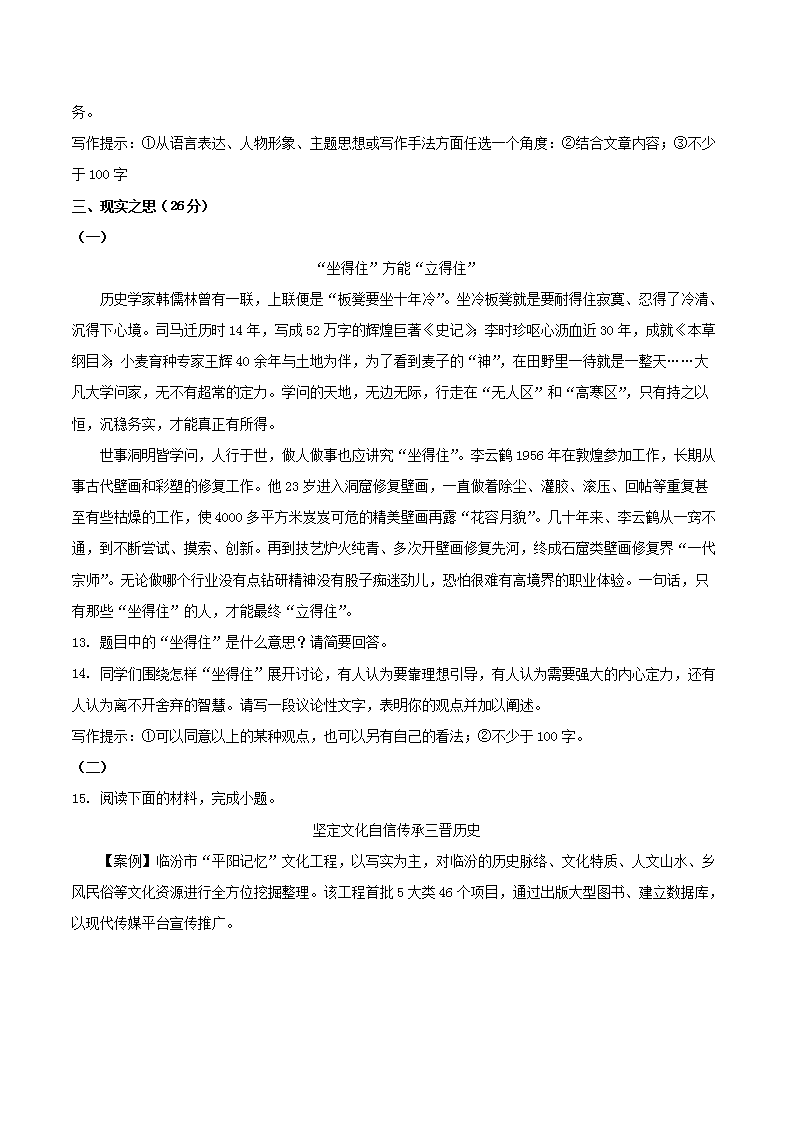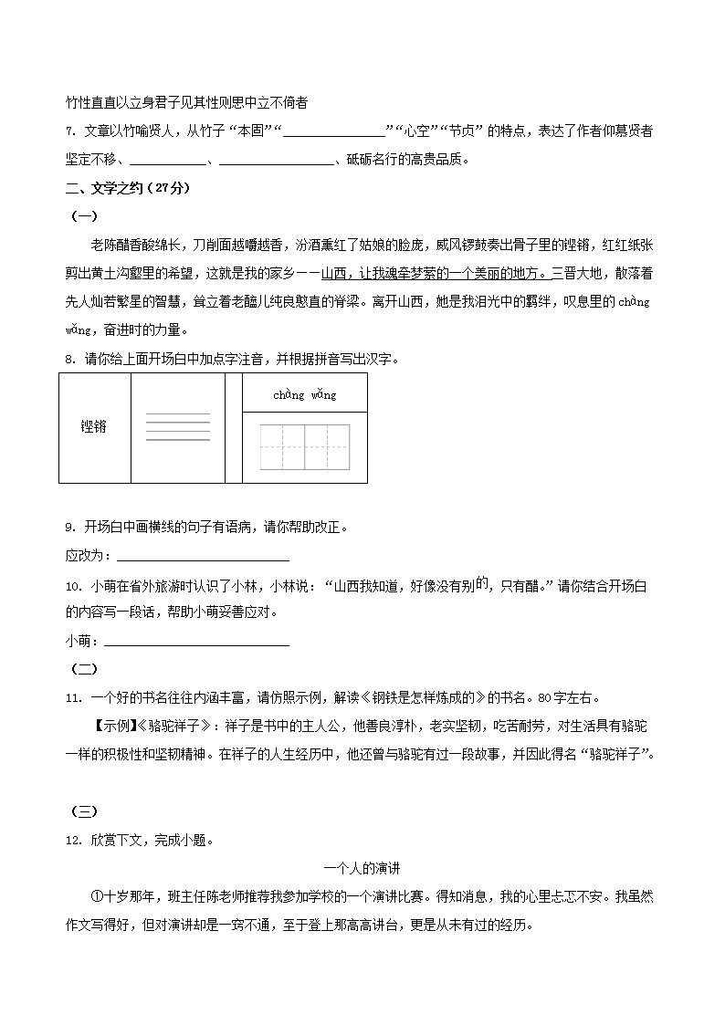 【文檔預覽】 無憂考網(wǎng)整理發(fā)布2023-2024學年山西省大同市陽高縣八年級下學期期末語文試題及答案(Word版),前五頁預覽如下: