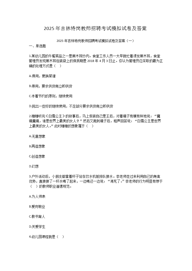 【文檔名稱】 2025年吉林特崗教師招聘考試模擬試卷及答案(Word版).doc