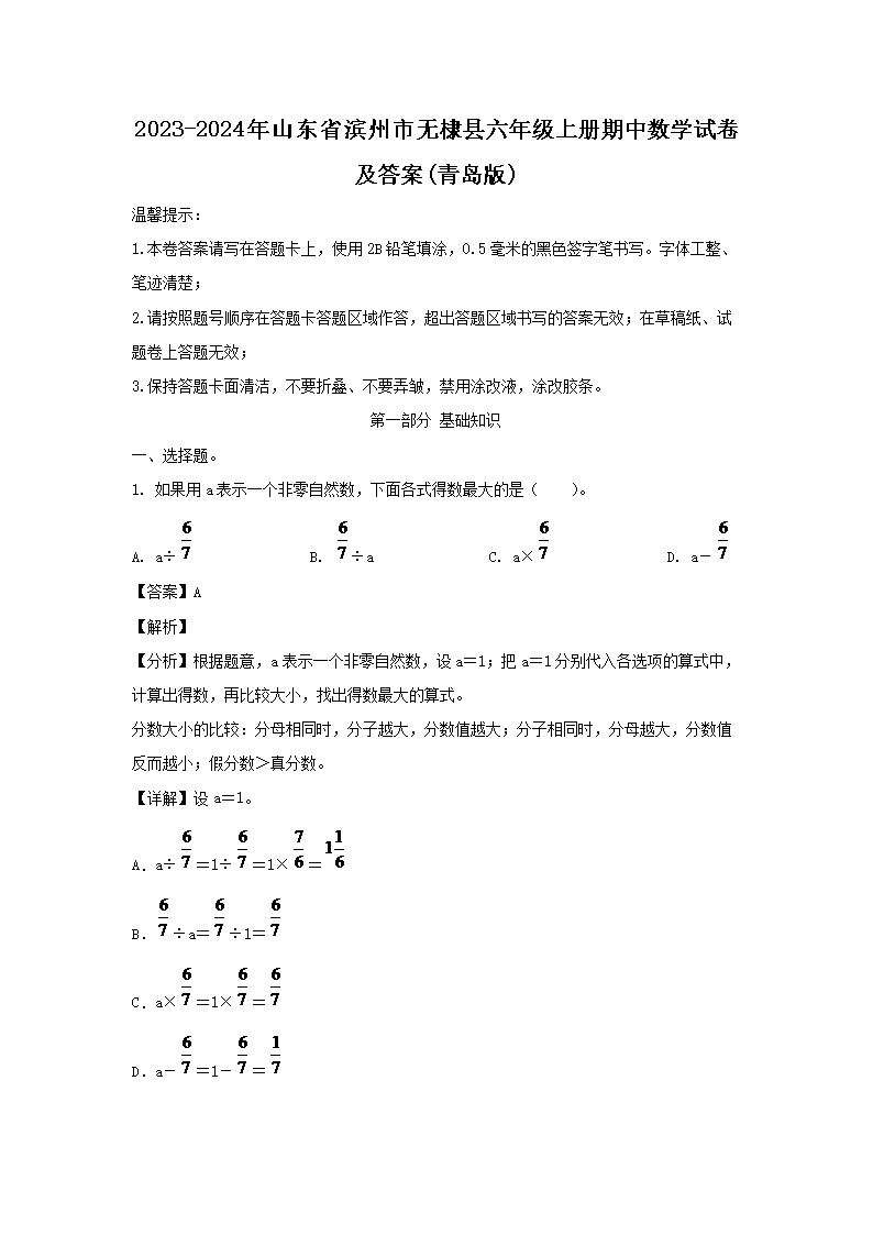 【文檔預(yù)覽】 無憂考網(wǎng)整理發(fā)布2023-2024年山東省濱州市無棣縣六年級上冊期中數(shù)學(xué)試卷及答案(青島版)(Word版),前五頁預(yù)覽如下: