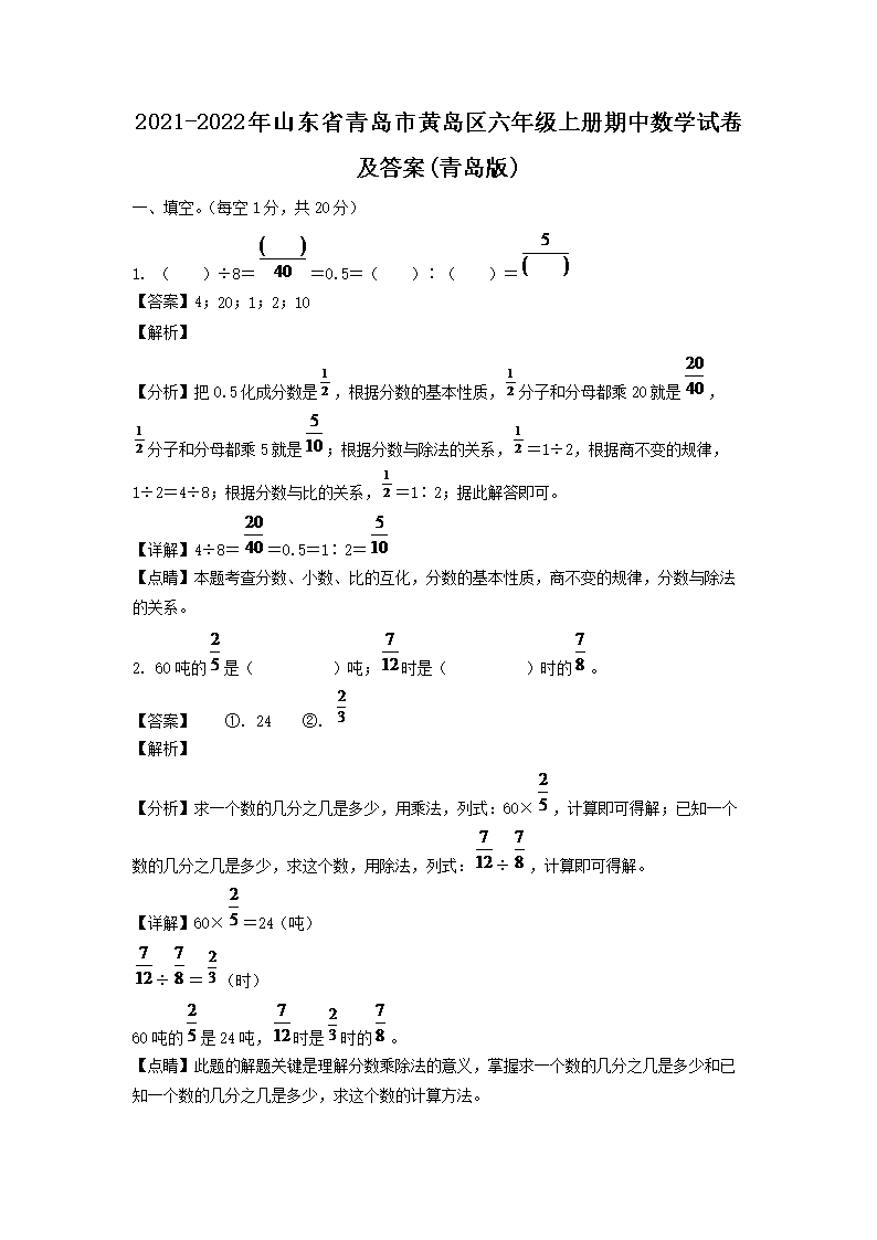 2021-2022年山東省青島市黃島區(qū)六年級(jí)上冊(cè)期中數(shù)學(xué)試卷及答案(青島版)(Word版)