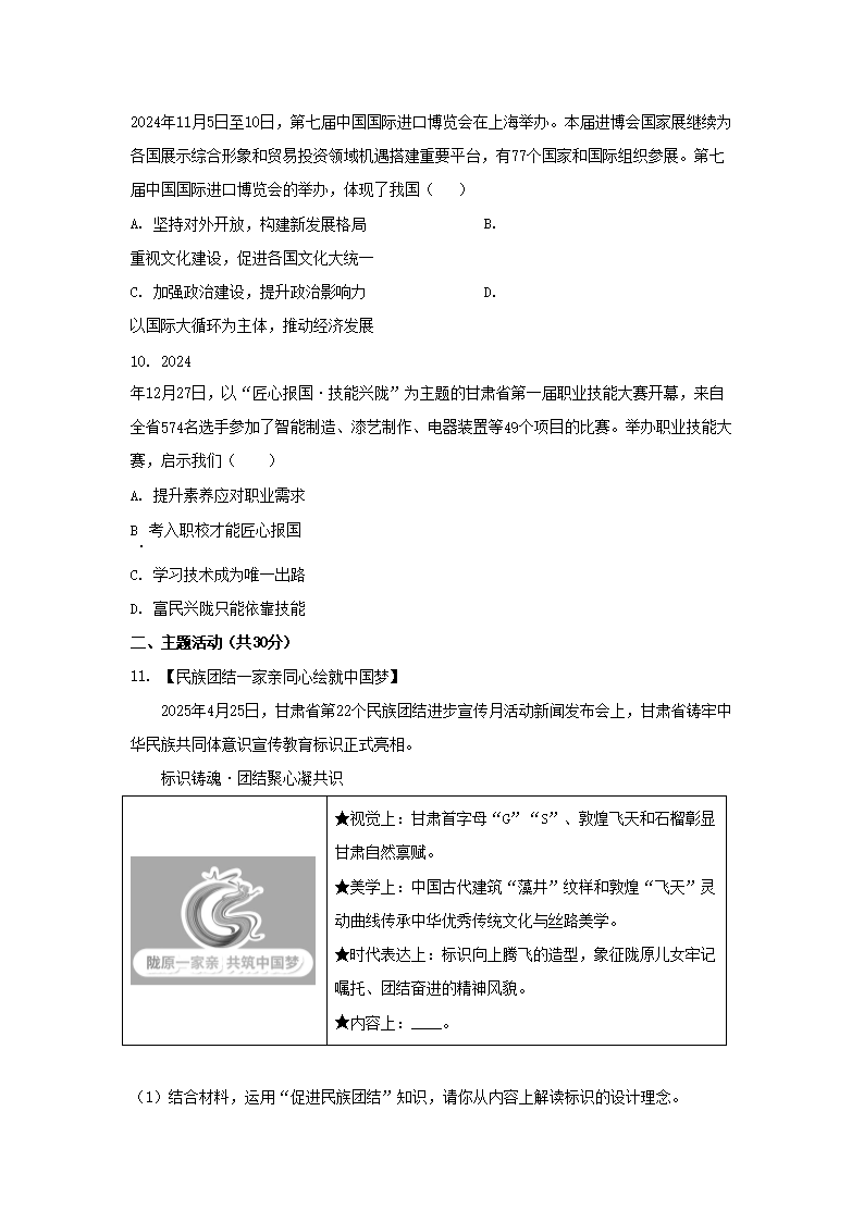 【文檔名稱】 2025年甘肅武威中考道德與法治試題及答案(Word版).doc