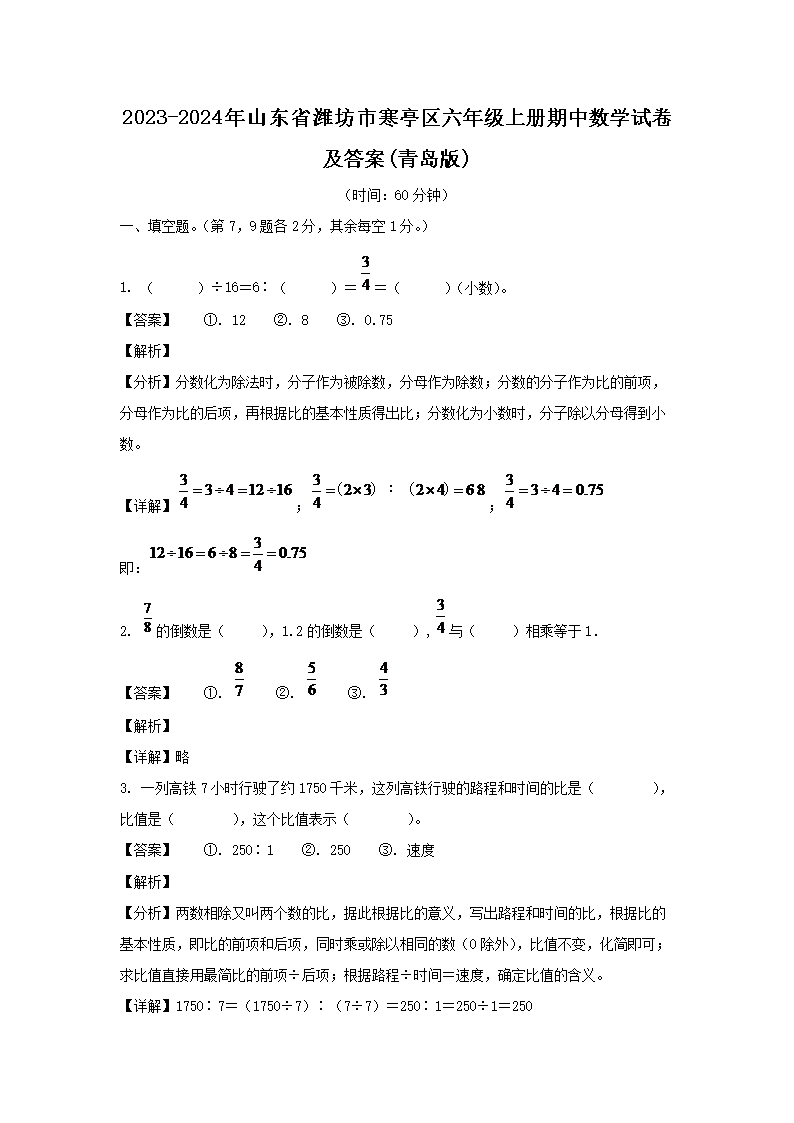 【文檔預(yù)覽】 無憂考網(wǎng)整理發(fā)布2023-2024年山東省濰坊市寒亭區(qū)六年級上冊期中數(shù)學(xué)試卷及答案(青島版)(Word版),前五頁預(yù)覽如下: