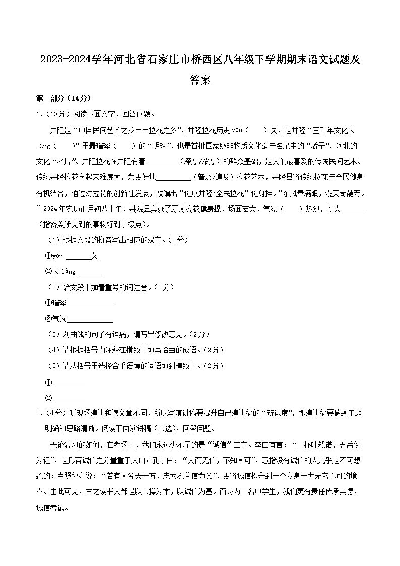 【文檔預覽】 無憂考網整理發(fā)布2023-2024學年河北省石家莊市橋西區(qū)八年級下學期期末語文試題及答案(Word版),前五頁預覽如下: