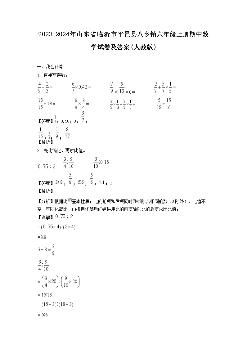 2023-2024年山東省臨沂市平邑縣八鄉(xiāng)鎮(zhèn)六年級上冊期中數(shù)學(xué)試卷及答案(人教版)(Word版)