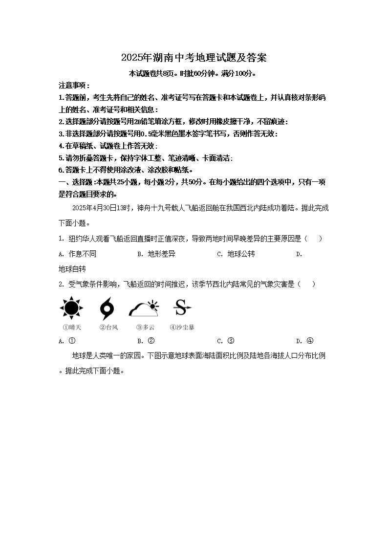 【文檔名稱】 2025年湖南中考地理試題及答案(Word版).doc
