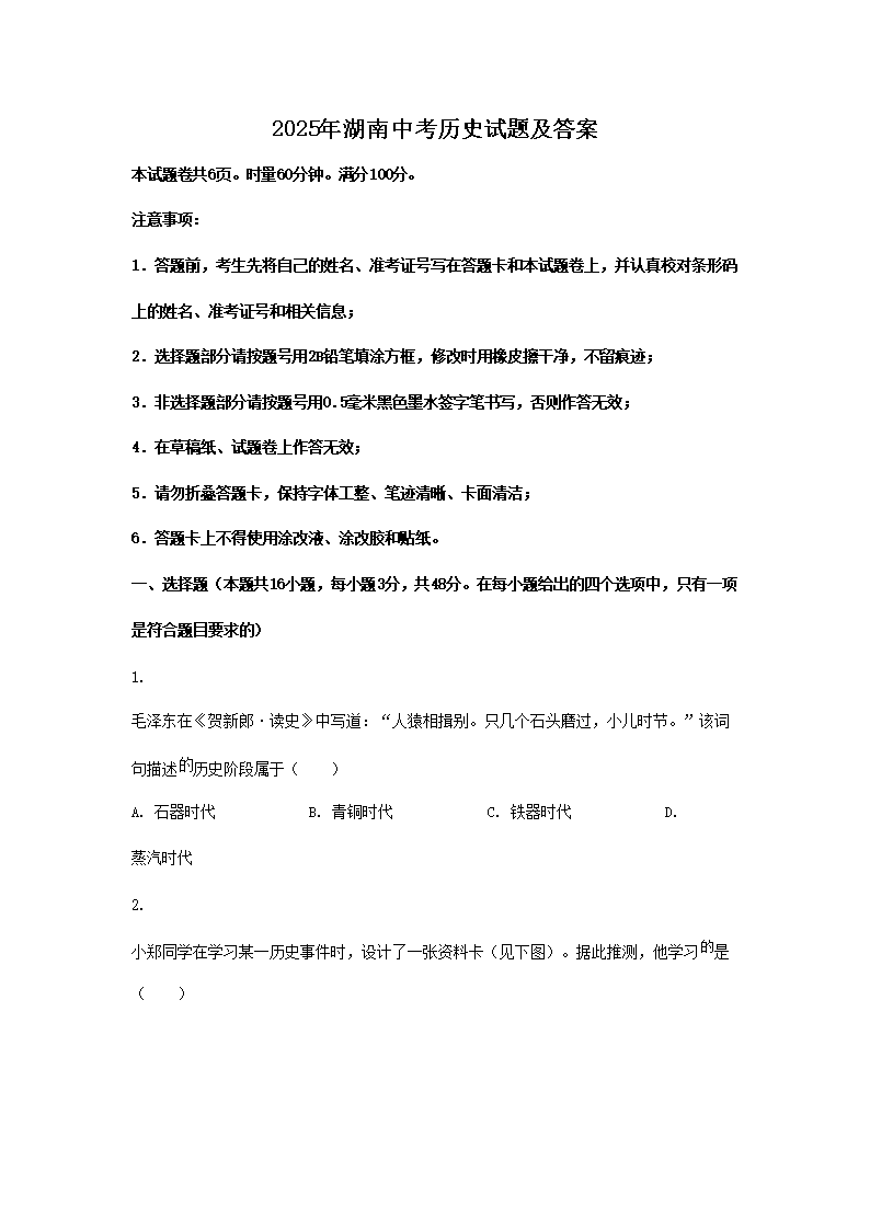 【文檔預覽】 無憂考網(wǎng)整理發(fā)布2025年湖南中考歷史試題及答案(Word版),前五頁預覽如下: