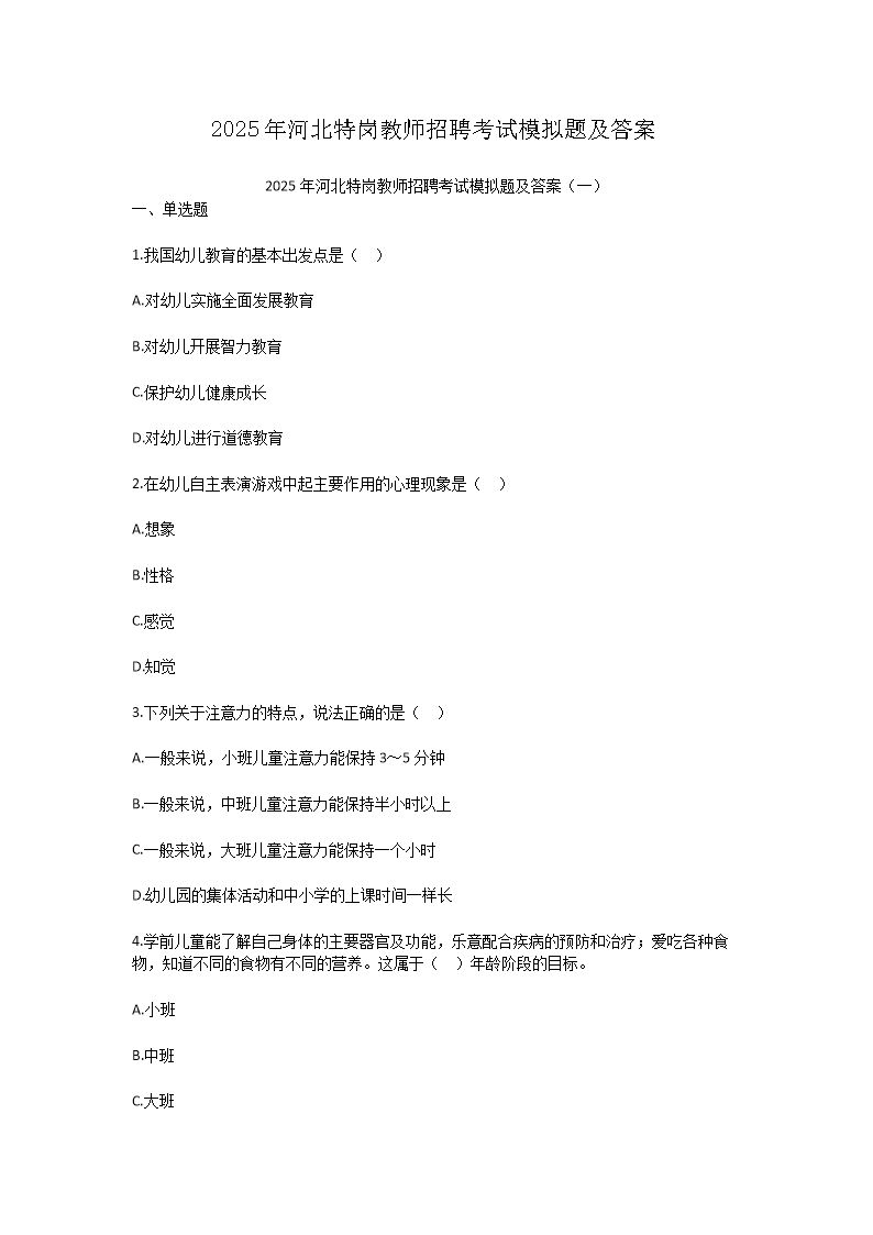 【文檔名稱】 2025年河北特崗教師招聘考試模擬題及答案(Word版).doc