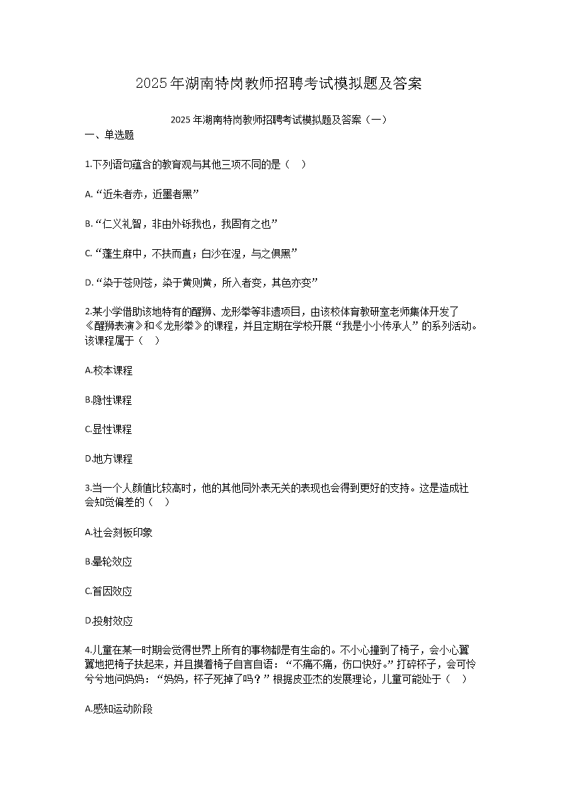 【文檔名稱】 2025年湖南特崗教師招聘考試模擬題及答案(Word版).doc