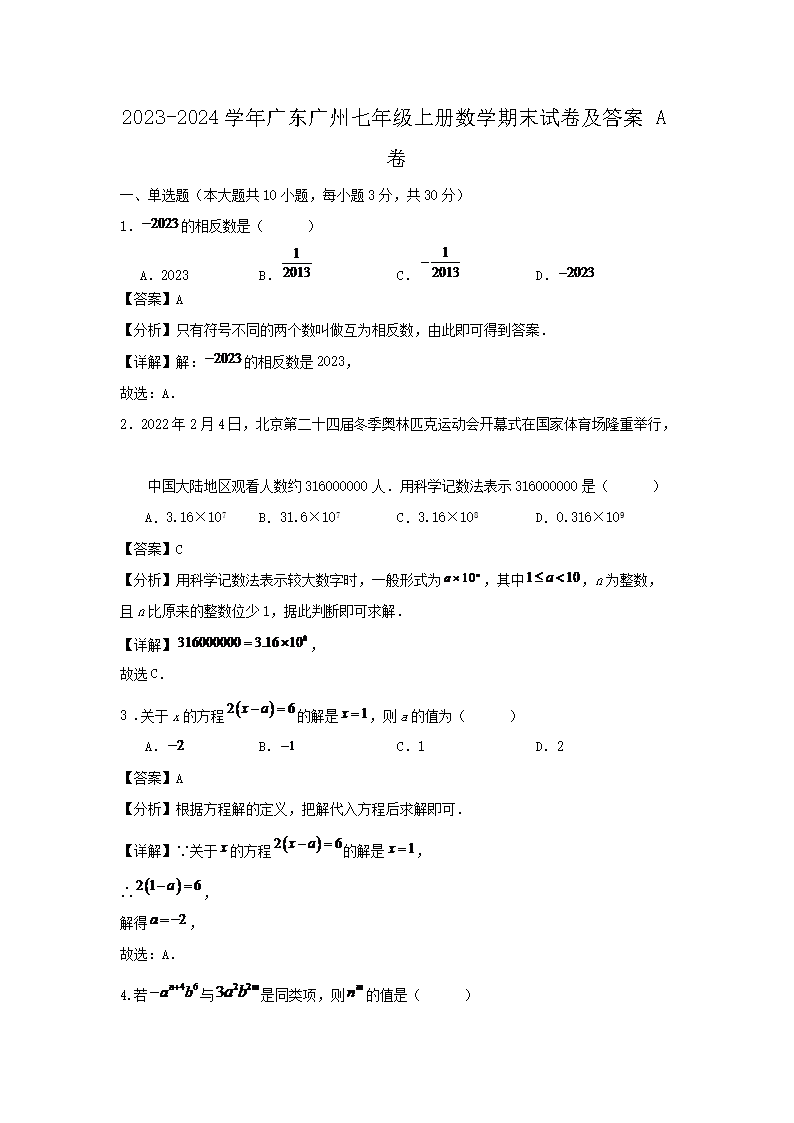 2023-2024學(xué)年廣東廣州七年級(jí)上冊(cè)數(shù)學(xué)期末試卷及答案A卷(Word版)