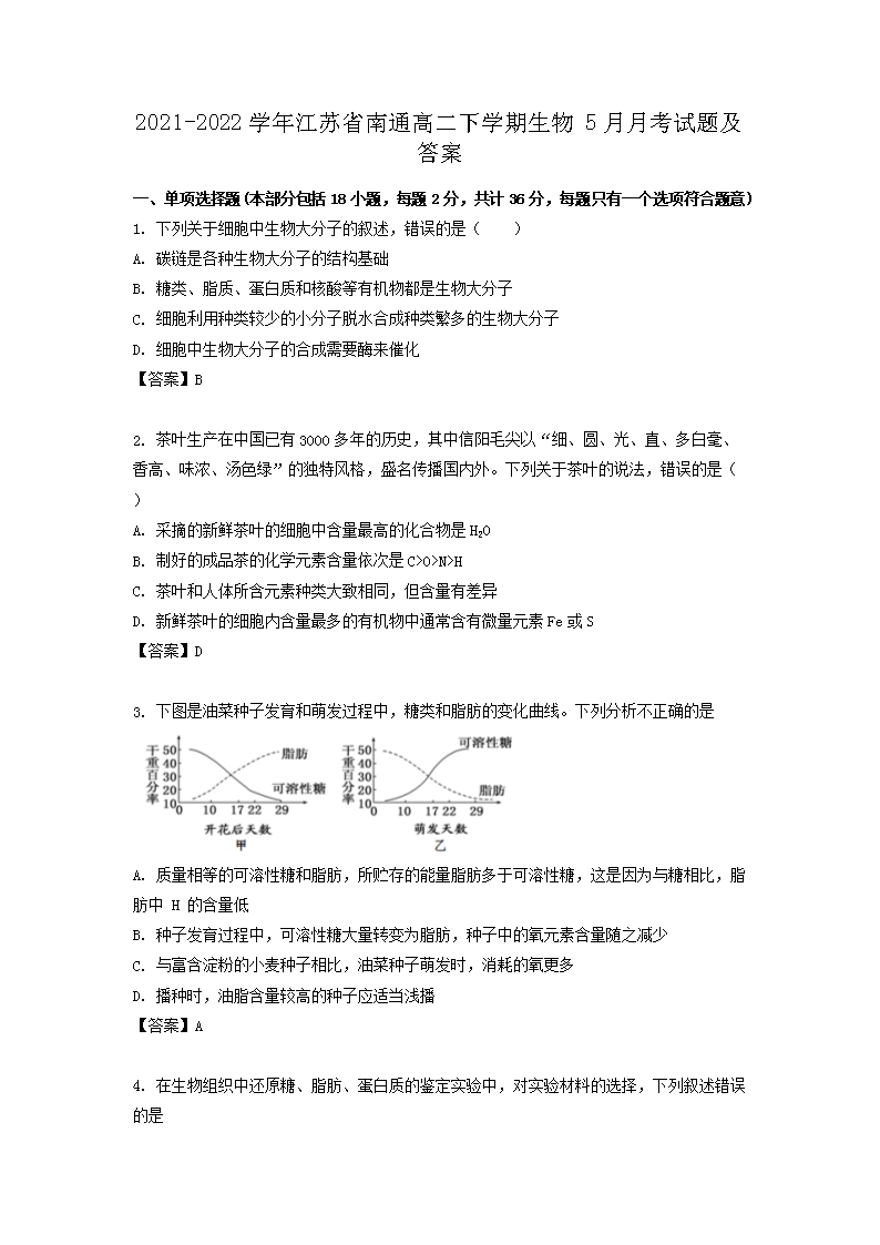 2021-2022學(xué)年江蘇省南通高二下學(xué)期生物5月月考試題及答案(Word版)
