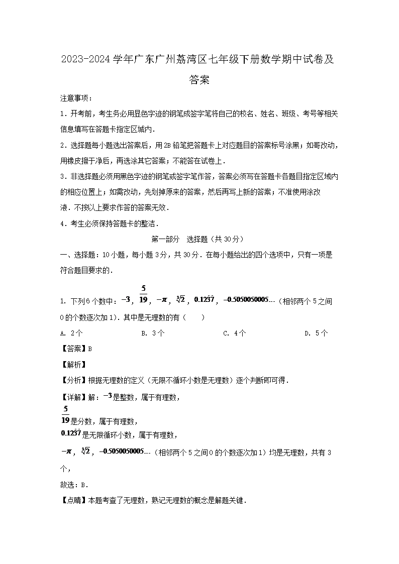 【文檔預(yù)覽】 無憂考網(wǎng)整理發(fā)布2023-2024學(xué)年廣東廣州荔灣區(qū)七年級下冊數(shù)學(xué)期中試卷及答案(Word版),前五頁預(yù)覽如下: