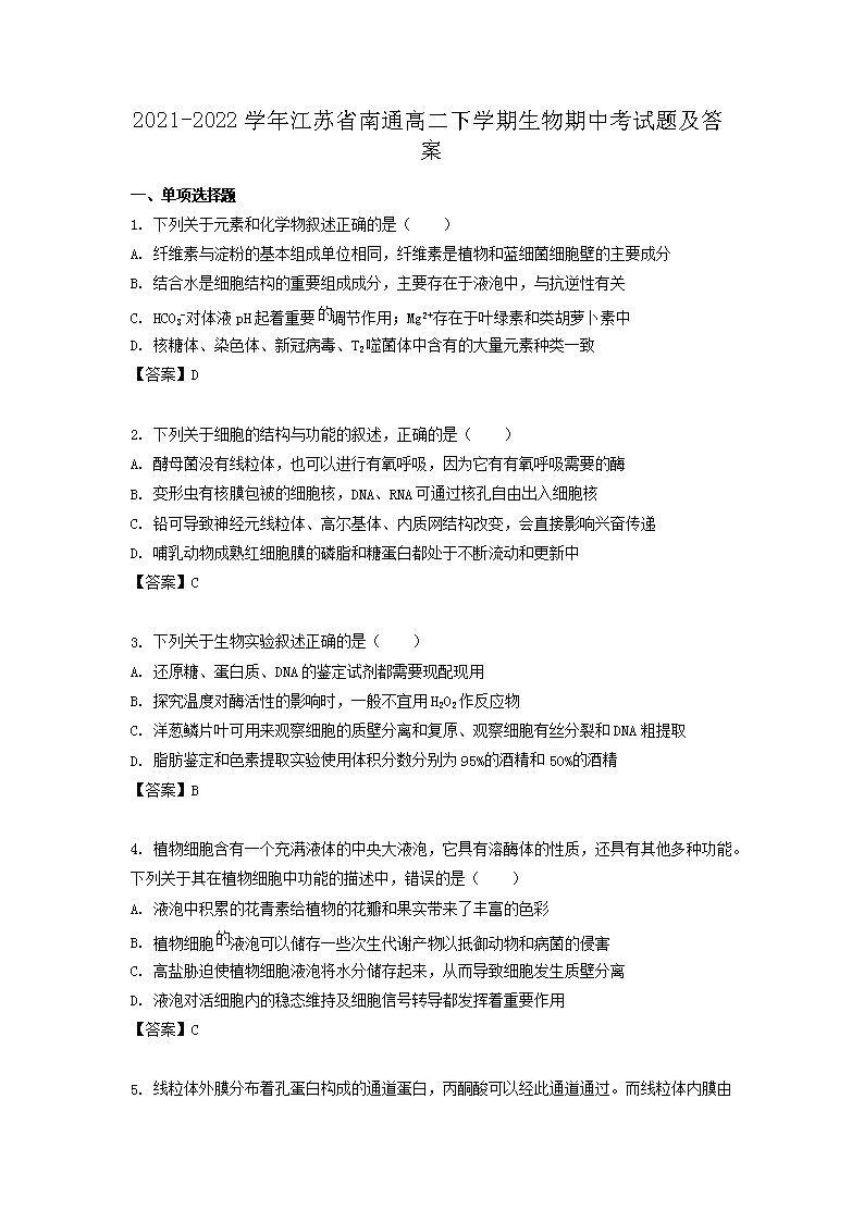 2021-2022學(xué)年江蘇省南通高二下學(xué)期生物期中考試題及答案(Word版)