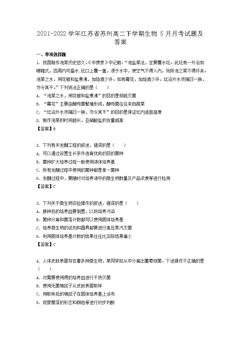 【文檔預(yù)覽】 無憂考網(wǎng)整理發(fā)布2021-2022學(xué)年江蘇省蘇州高二下學(xué)期生物5月月考試題及答案(Word版),前五頁預(yù)覽如下: