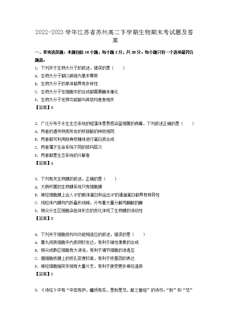 【文檔名稱】 2022-2023學年江蘇省蘇州高二下學期生物期末考試題及答案(Word版).doc