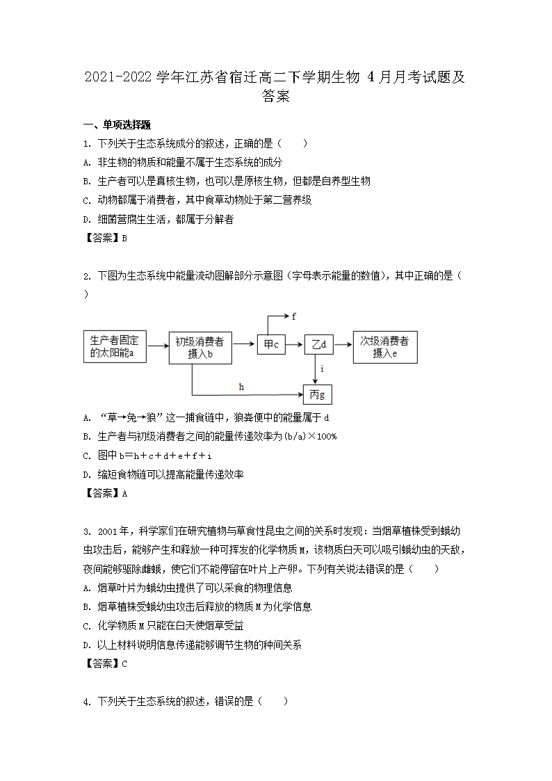 【文檔名稱】 2021-2022學年江蘇省宿遷高二下學期生物4月月考試題及答案(Word版).doc
