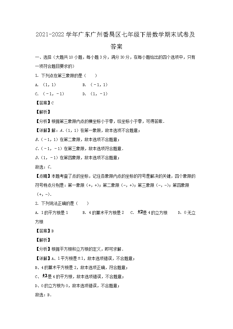 時(shí)間:2025-06-30 17:42:00 來(lái)源:無(wú)憂考網(wǎng) [字體:小 中 大]【文檔名稱】 2021-2022學(xué)年廣東廣州番禺區(qū)七年級(jí)下冊(cè)數(shù)學(xué)期末試卷及答案(Word版).doc