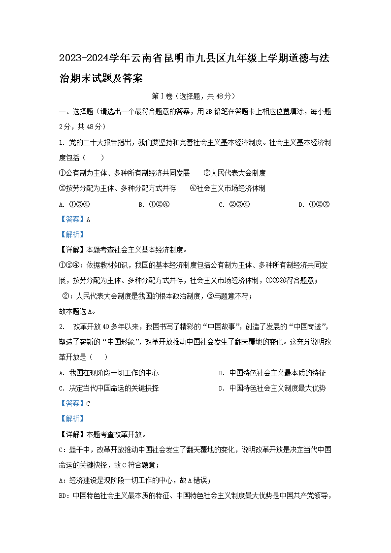 【文檔預(yù)覽】 無(wú)憂考網(wǎng)整理發(fā)布2023-2024學(xué)年云南省昆明市九縣區(qū)九年級(jí)上學(xué)期道德與法治期末試題及答案(Word版),前五頁(yè)預(yù)覽如下: