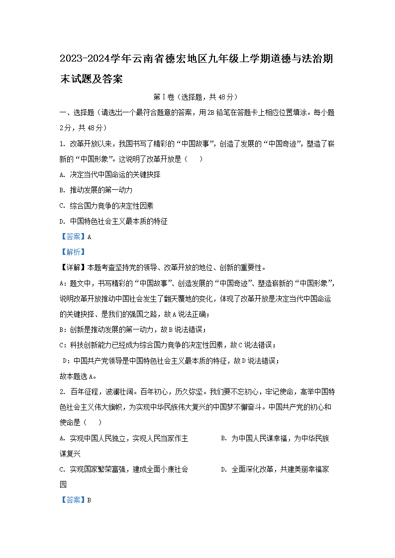 時間:2025-07-01 11:54:00 來源:無憂考網(wǎng) [字體:小 中 大]【文檔名稱】 2023-2024學(xué)年云南省德宏地區(qū)九年級上學(xué)期道德與法治期末試題及答案(Word版).doc