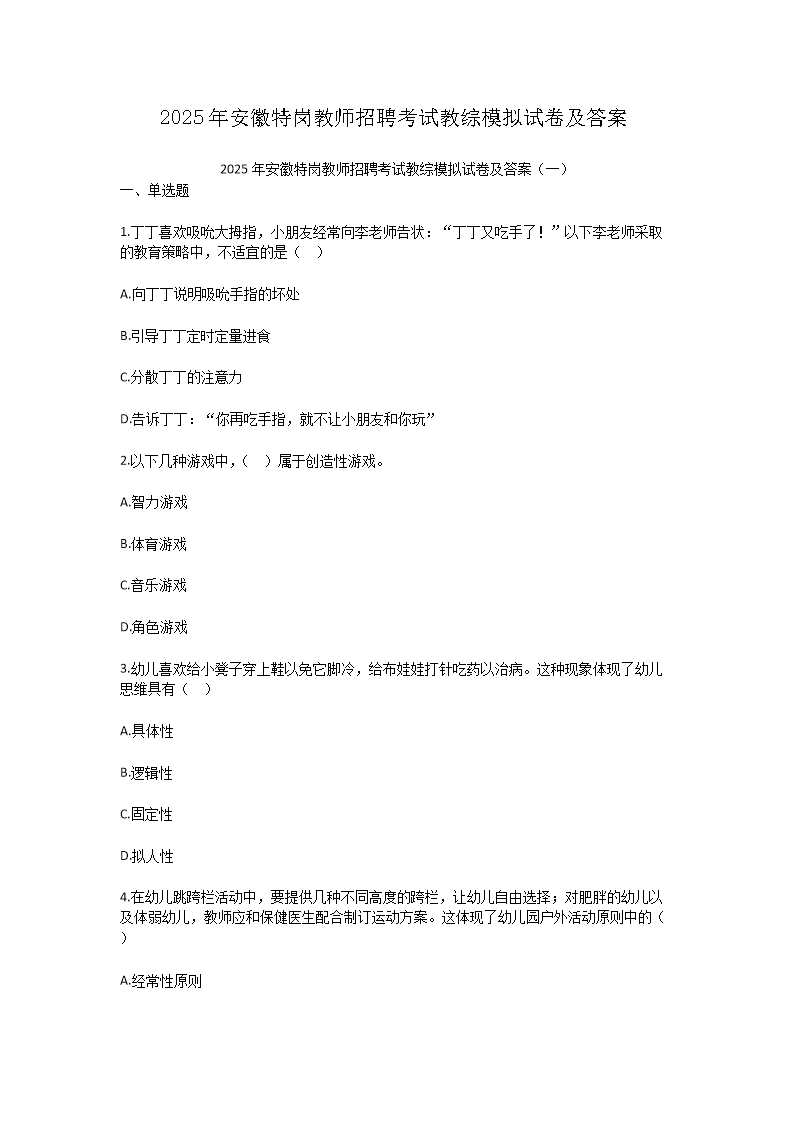 【文檔預覽】 無憂考網整理發(fā)布2025年安徽特崗教師招聘考試教綜模擬試卷及答案(Word版),前五頁預覽如下: