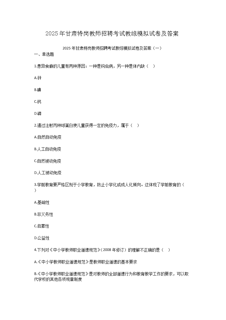 【文檔預(yù)覽】 無憂考網(wǎng)整理發(fā)布2025年甘肅特崗教師招聘考試教綜模擬試卷及答案(Word版),前五頁預(yù)覽如下: