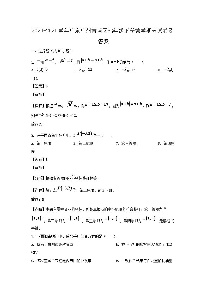 【文檔名稱】 2020-2021學年廣東廣州黃埔區(qū)七年級下冊數(shù)學期末試卷及答案(Word版).doc