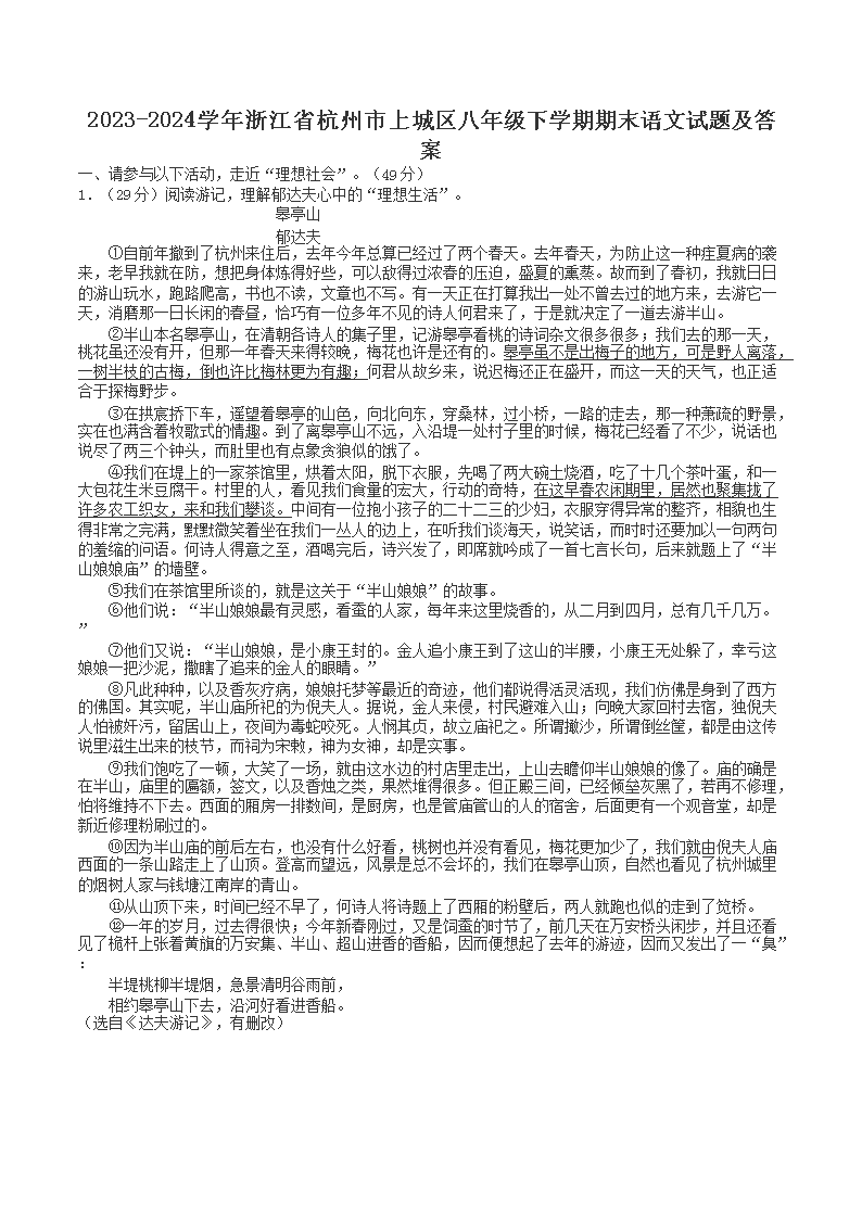 時間:2025-07-01 17:34:00 來源:無憂考網(wǎng) [字體:小 中 大]【文檔名稱】 2023-2024學(xué)年浙江省杭州市上城區(qū)八年級下學(xué)期期末語文試題及答案(Word版).doc
