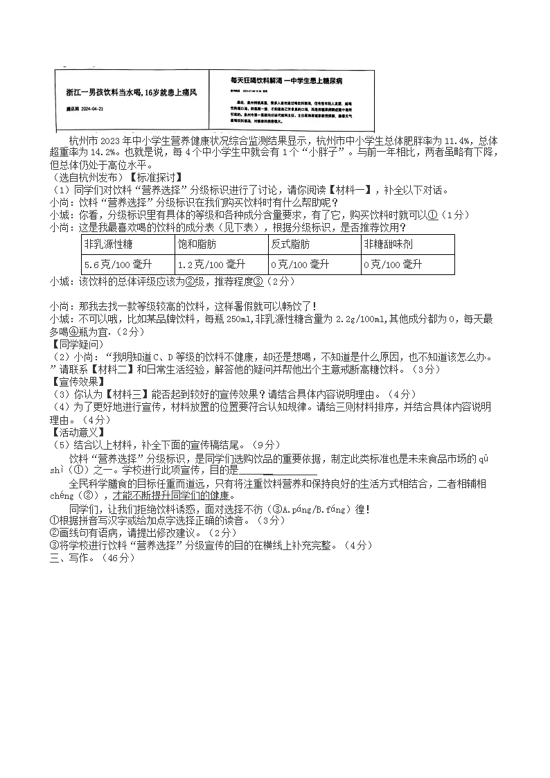 2023-2024學(xué)年浙江省杭州市上城區(qū)八年級下學(xué)期期末語文試題及答案(Word版)