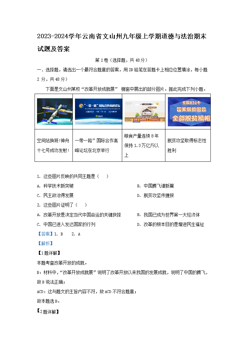 時(shí)間:2025-07-02 09:09:00 來(lái)源:無(wú)憂考網(wǎng) [字體:小 中 大]【文檔名稱】 2023-2024學(xué)年云南省文山州九年級(jí)上學(xué)期道德與法治期末試題及答案(Word版).doc