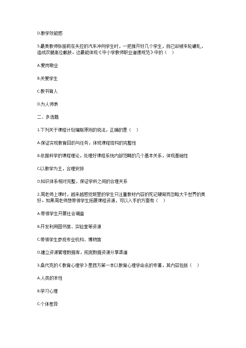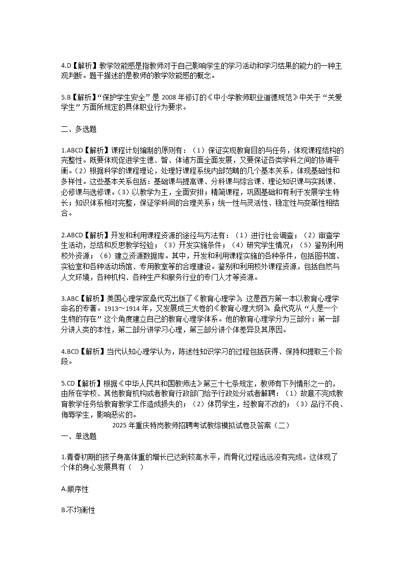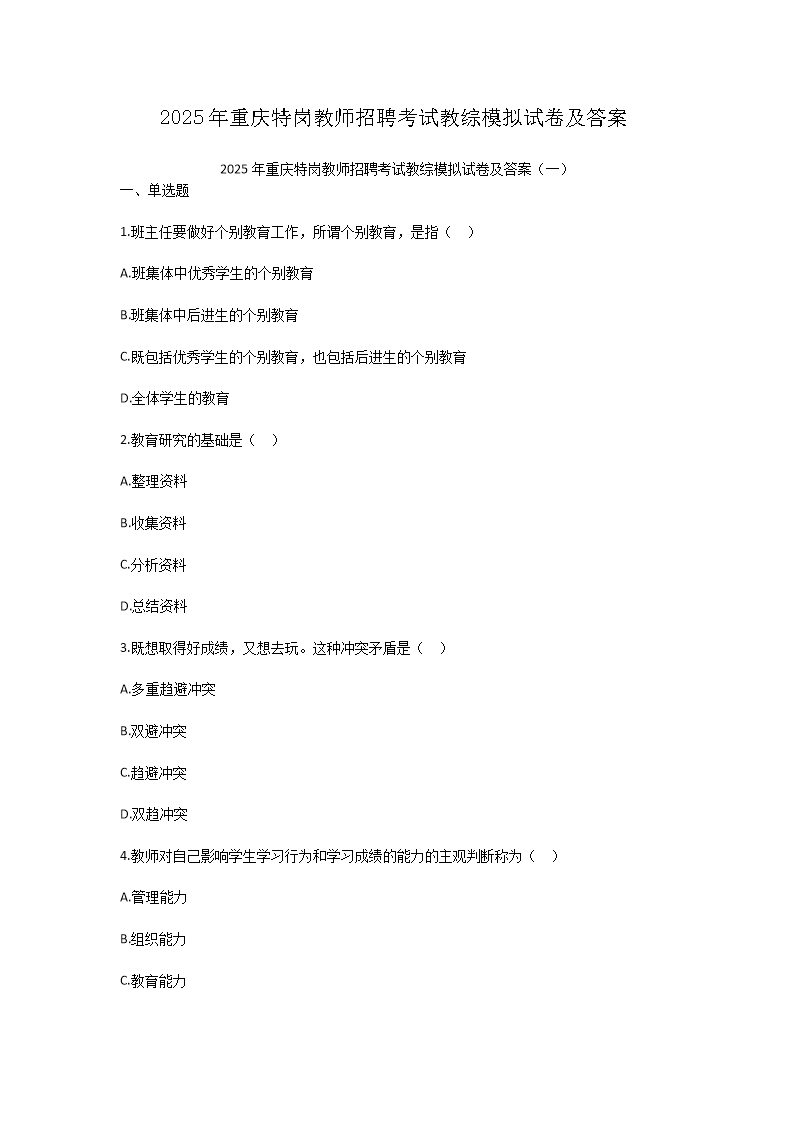 【文檔名稱】 2025年重慶特崗教師招聘考試教綜模擬試卷及答案(Word版).doc