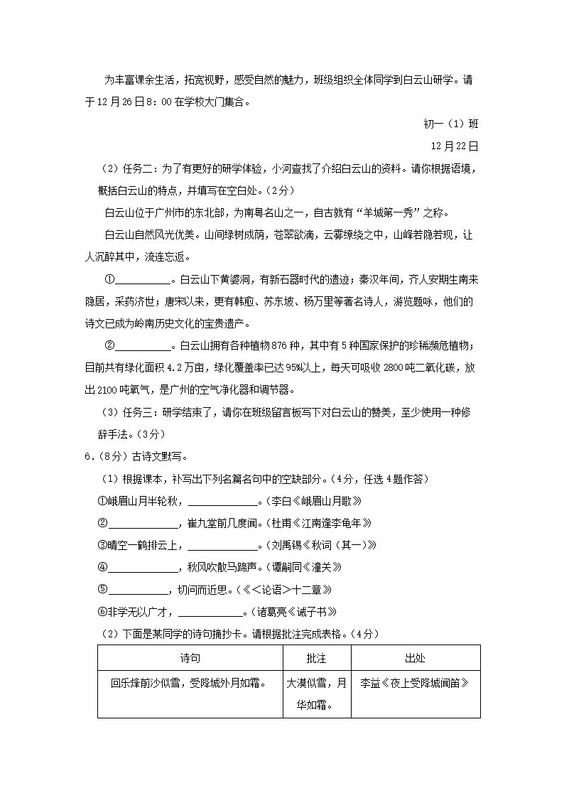 - 2024-2025學年廣東廣州越秀區(qū)七年級上冊語文期末試卷及答案