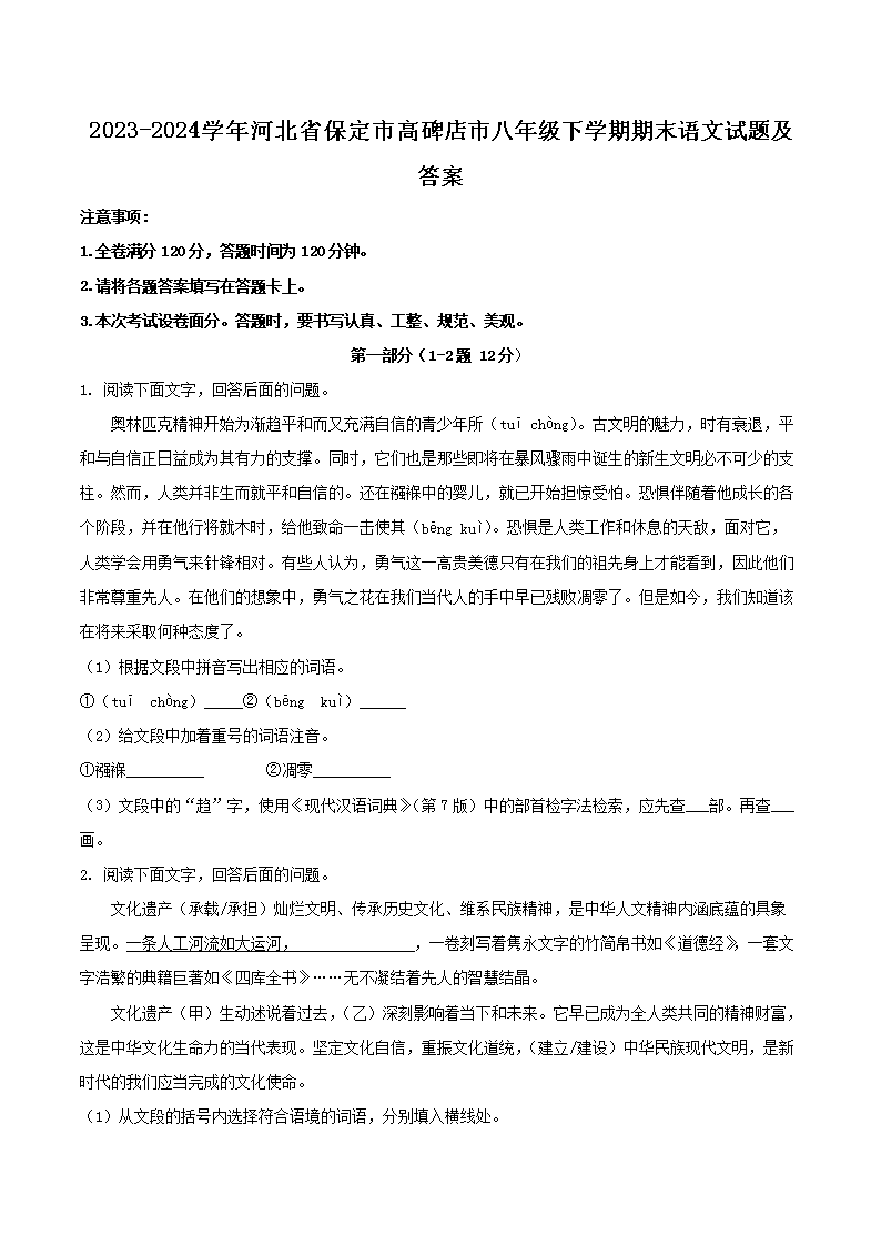 2023-2024學(xué)年河北省保定市高碑店市八年級(jí)下學(xué)期期末語文試題及答案(Word版)