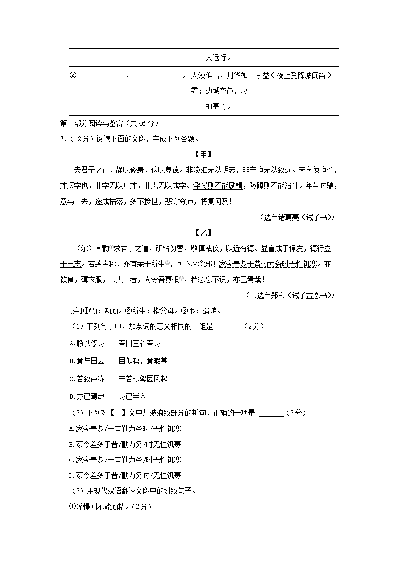 - 2022-2023學(xué)年重慶巴南區(qū)七年級下冊語文期末試卷及答案