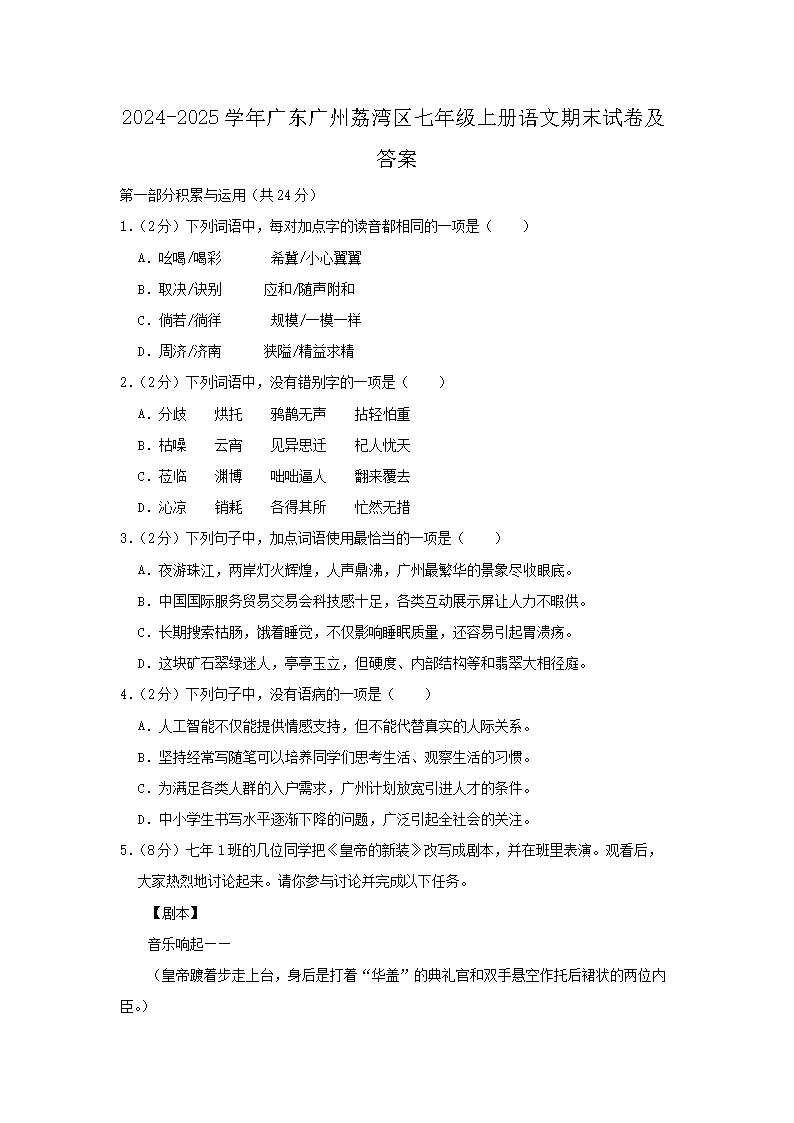 【文檔名稱】 2024-2025學(xué)年廣東廣州荔灣區(qū)七年級上冊語文期末試卷及答案(Word版).doc