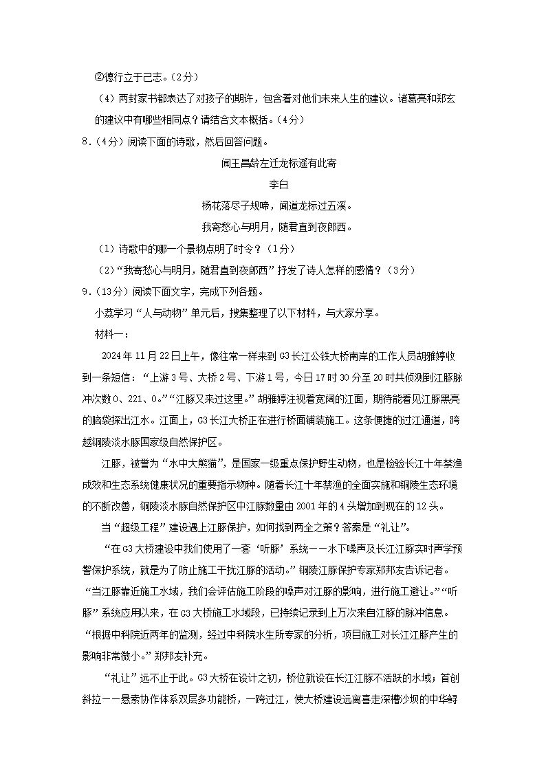 - 2023-2024學(xué)年重慶江津區(qū)七年級下冊語文期中試卷及答案